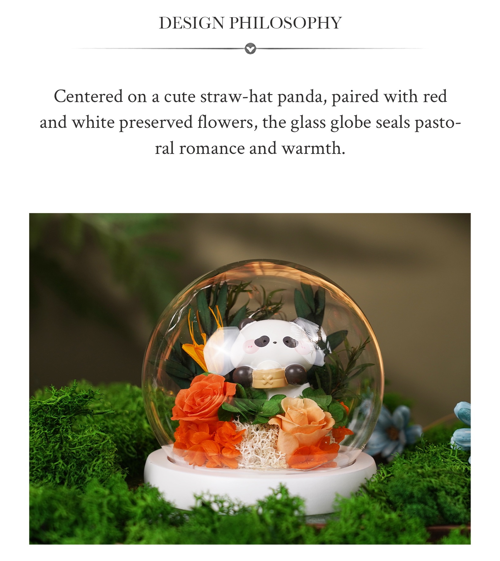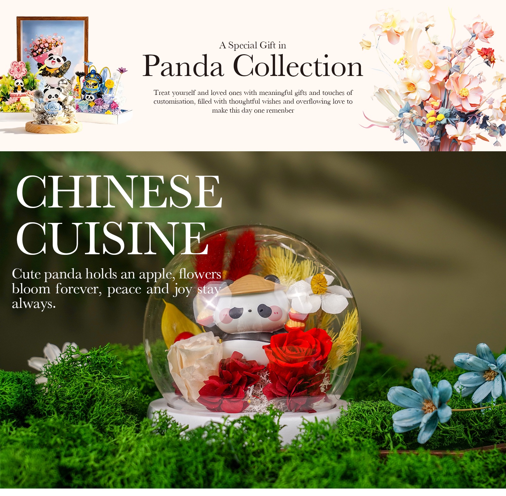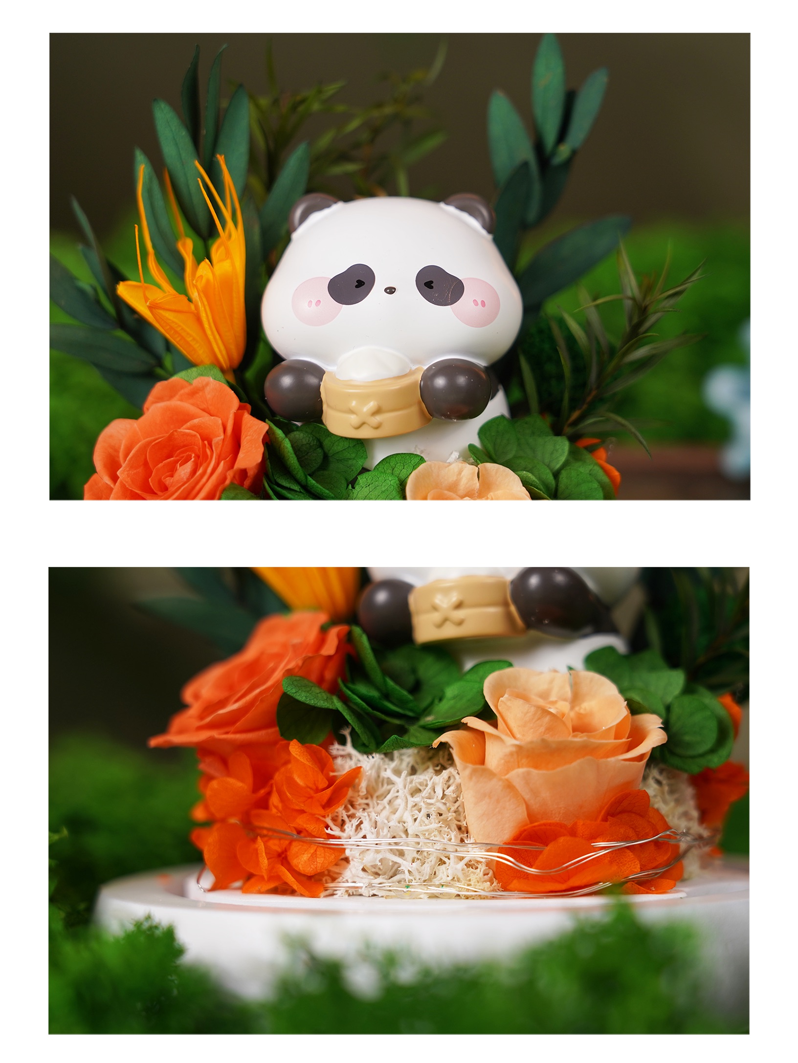 Add a playful touch of charm and warmth to any space with this adorable tea-pouring panda preserved flower design. The built-in LED night light softly illuminates the panda and florals.