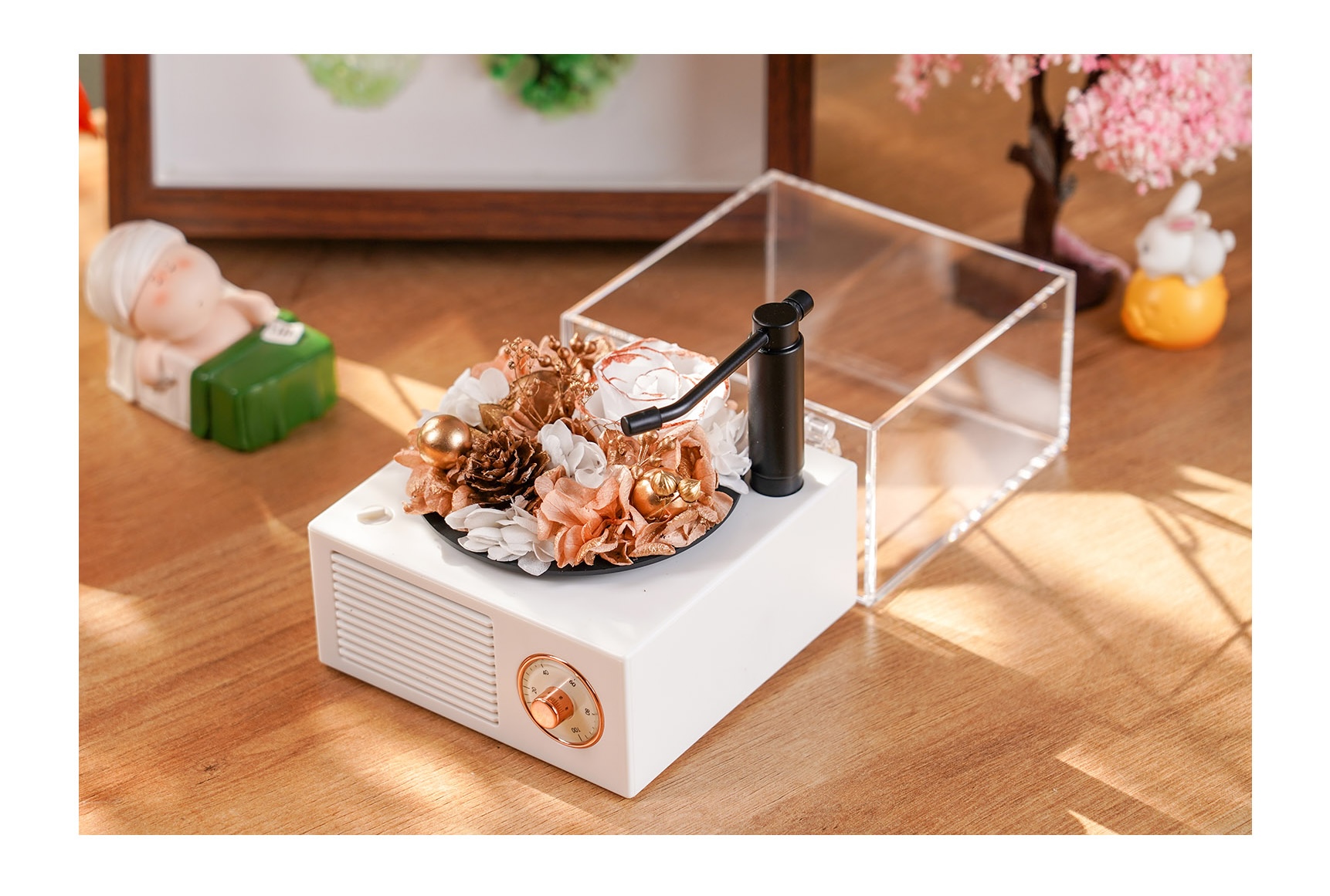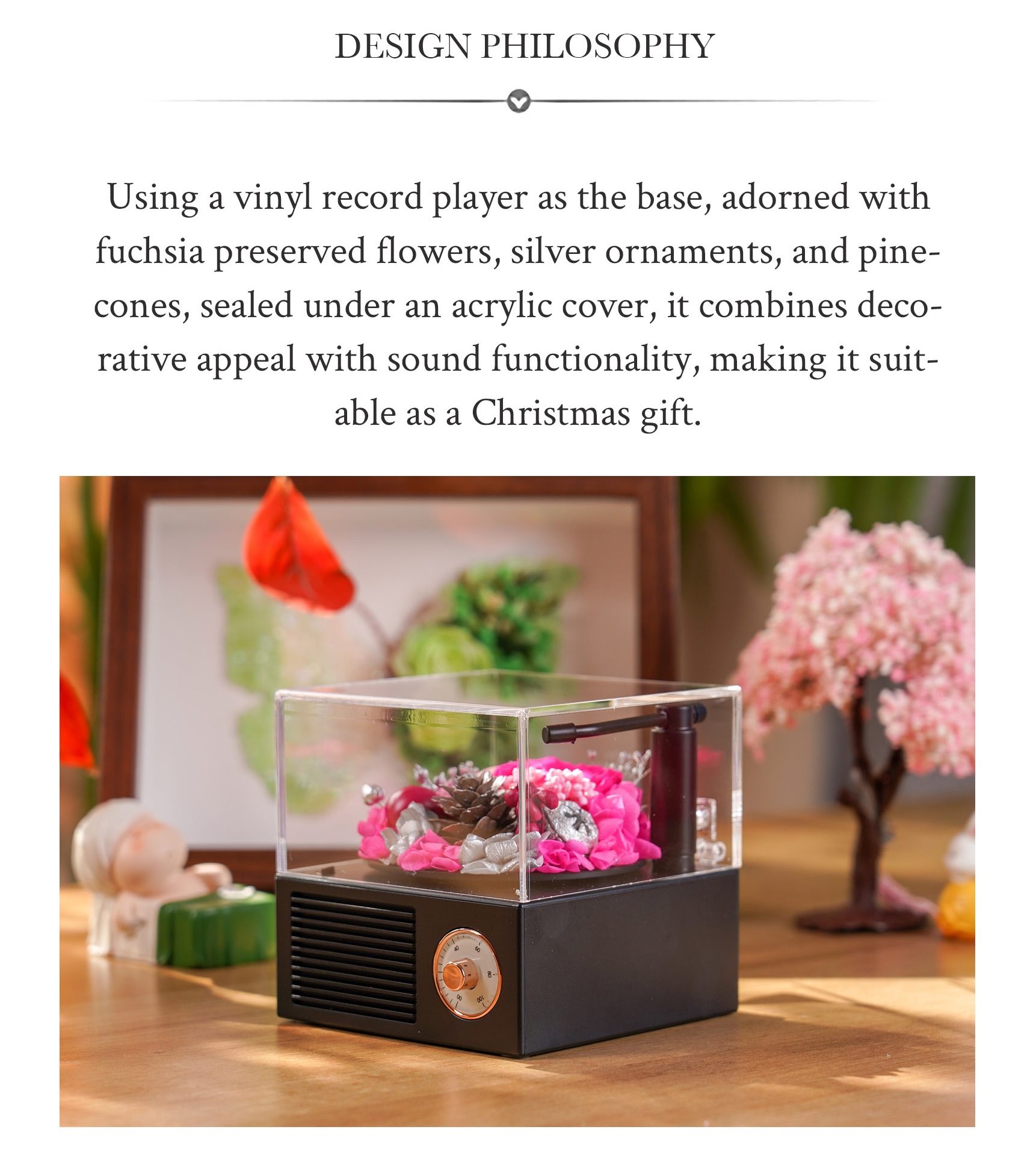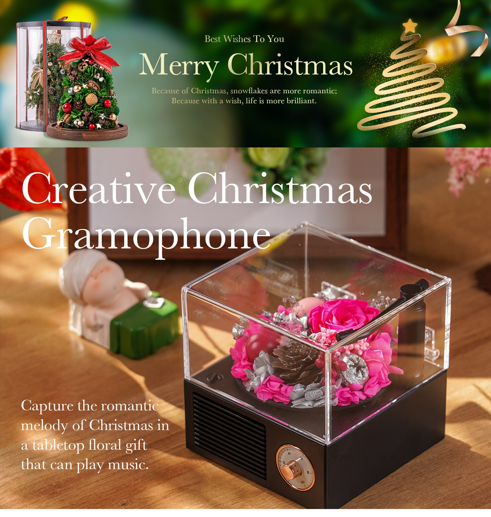 A festive twist on the classic gramophone — featuring preserved roses that gently rotate as music plays, radiating warmth and holiday charm. With Bluetooth, wired, and SD card playback, this elegant piece blends timeless romance with the joyful spirit of Christmas.