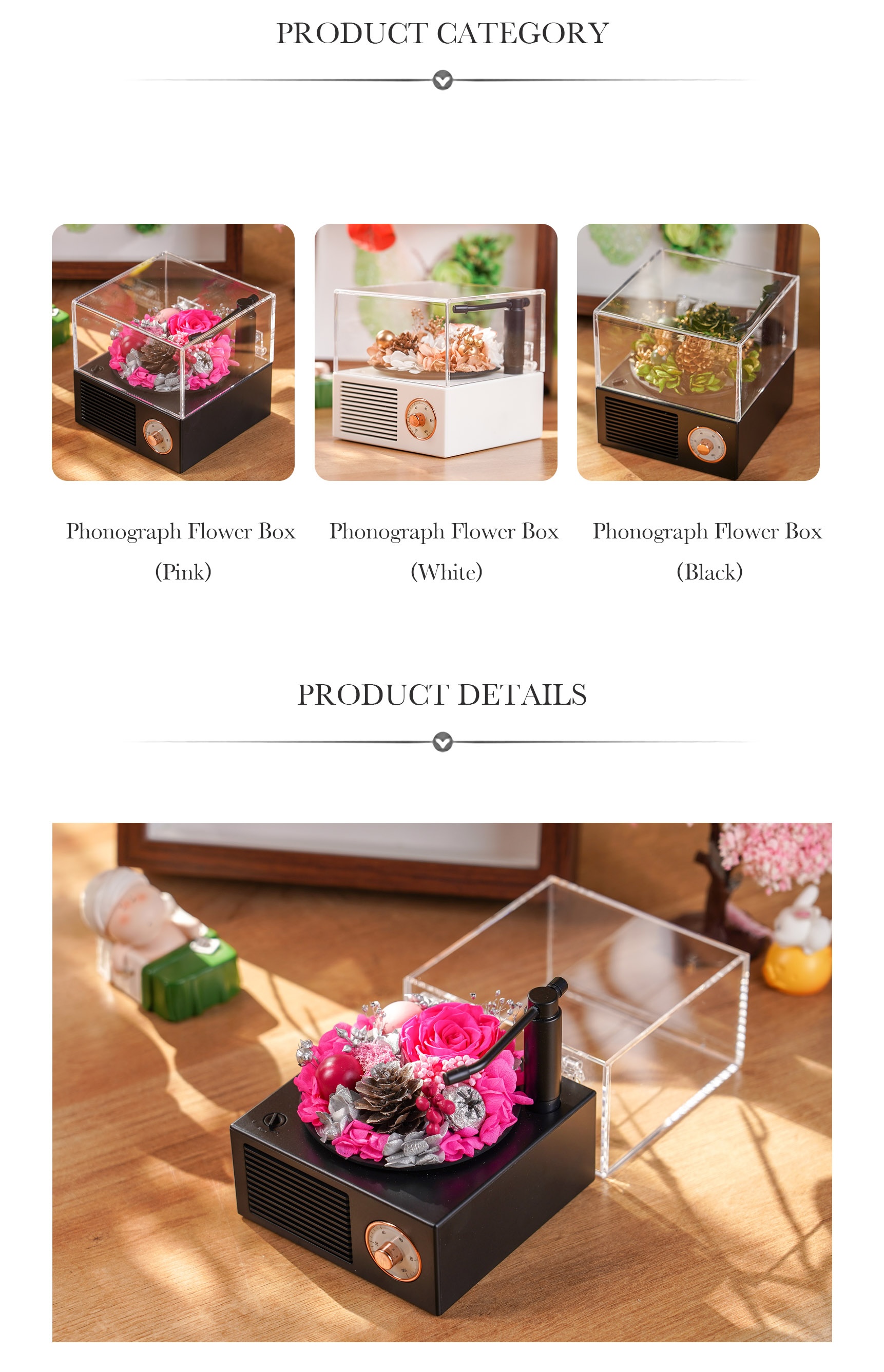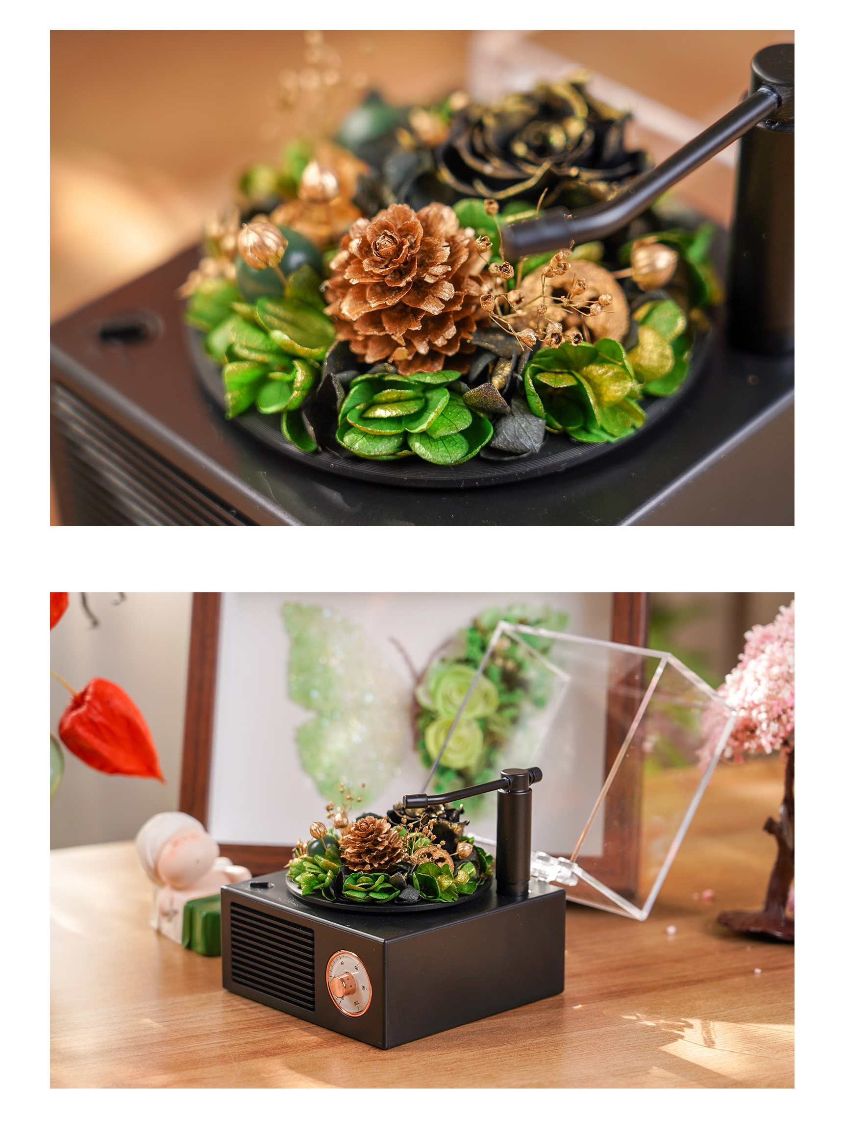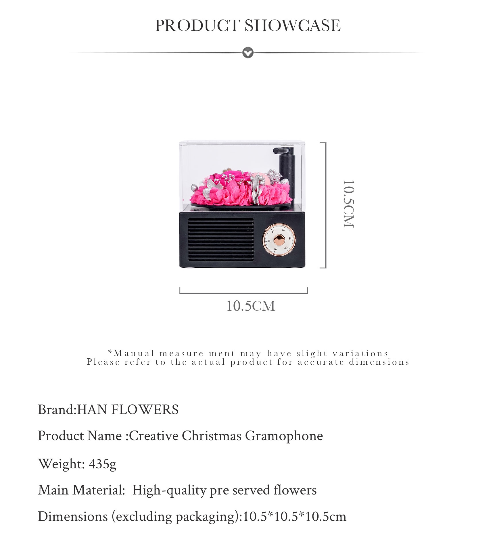 A festive twist on the classic gramophone — featuring preserved roses that gently rotate as music plays, radiating warmth and holiday charm. With Bluetooth, wired, and SD card playback, this elegant piece blends timeless romance with the joyful spirit of Christmas.