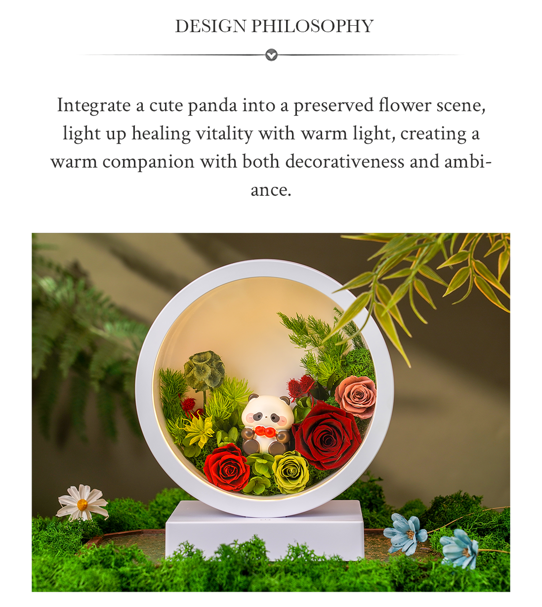Bring warmth and charm to any room with this LED bedside lamp. It features a preserved rose surrounded by a cute panda design, creating a soft, romantic glow.
