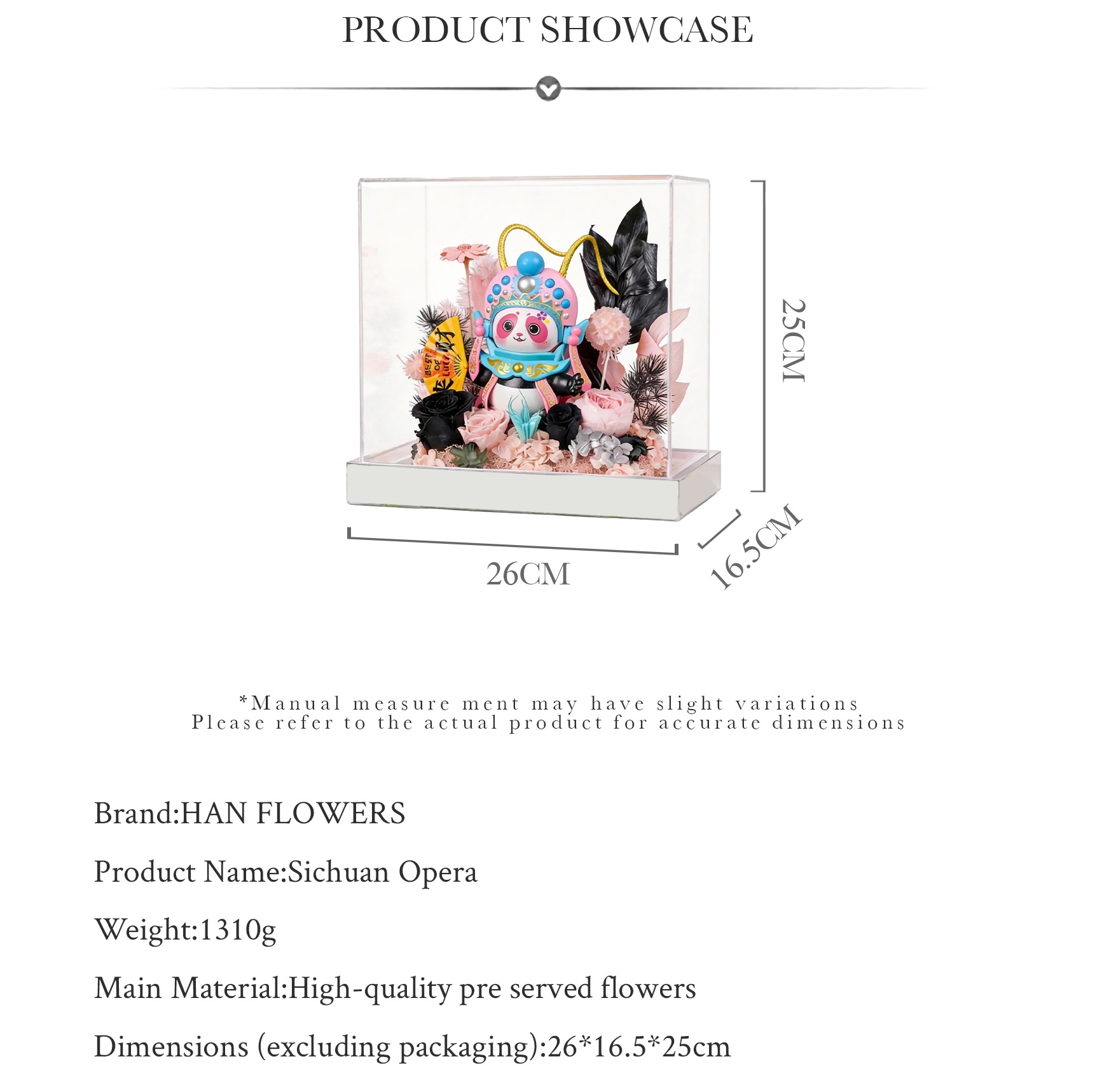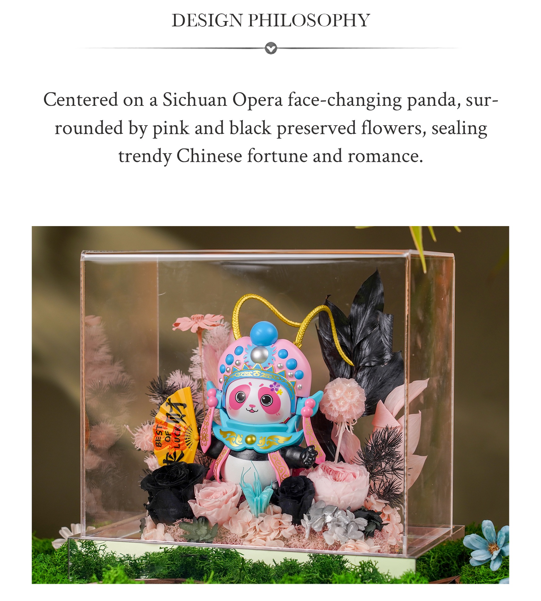 Bring home a unique blend of cuteness and culture with this preserved flower panda gift. Featuring the Sichuan Opera Bian Lian (face-changing) design in the Blue Series.
