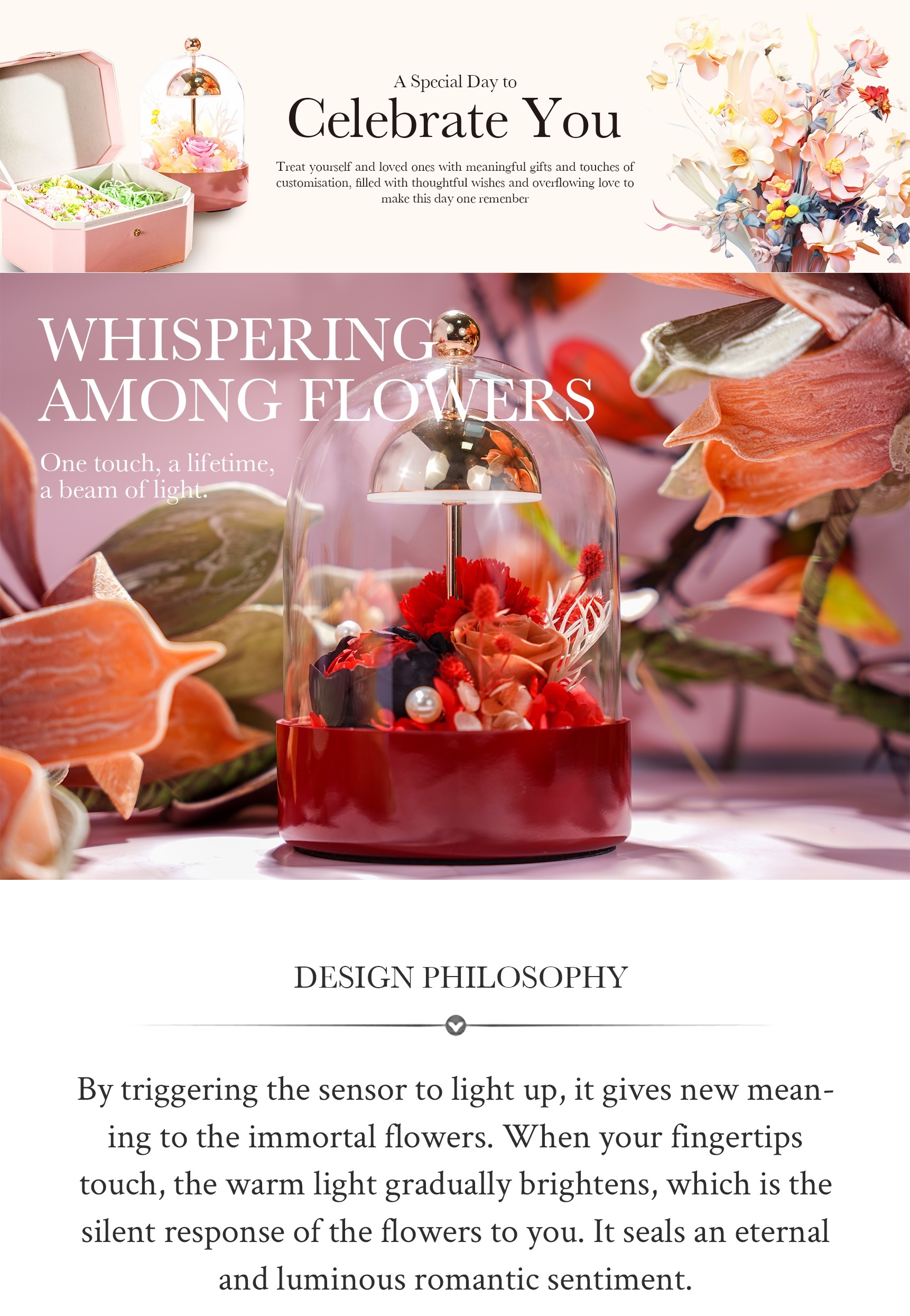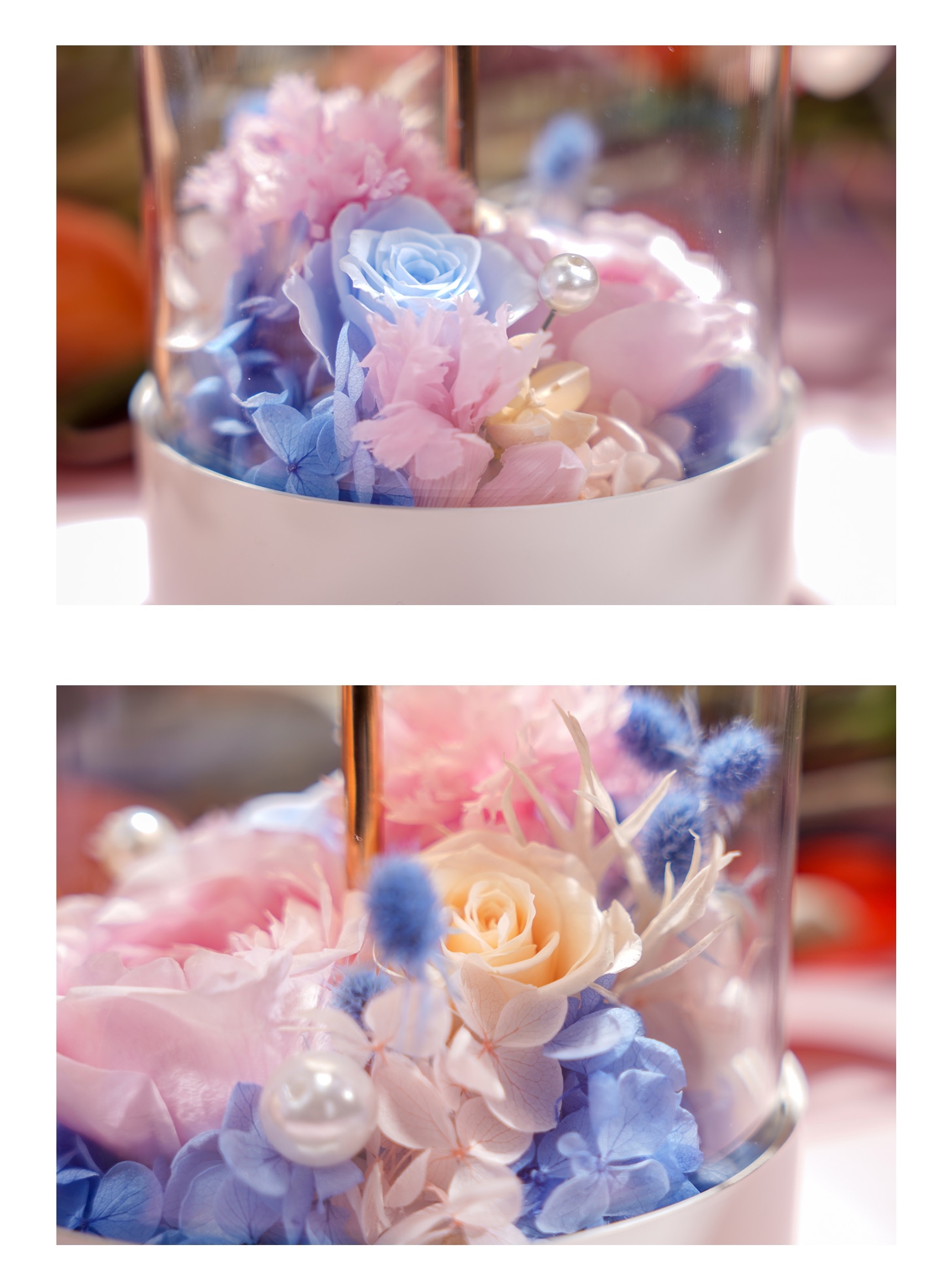 Delicate preserved flowers form a charming mini cluster under a clear dome, with adjustable LED lighting to create your preferred mood and a warm, romantic glow.